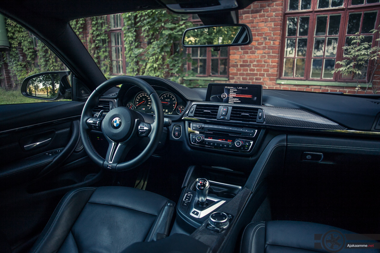 Lisävarusteena tarjottava Comfort Access tarkoittaa, ettei avainta tarvitse kaivaa taskusta autoa lähestyttäessä. Pelkkä oven avaaminen riittää aukaisemaan näkymän upeasti viimeisteltyyn sisustaan. Vaikka koeajettu yksilö onkin kojelautaa myöden täynnä nahkaa, ei perusvarusteltukaan M4 varmasti vaikuta halvalta. Hiilikuitusomisteista sisustassa sen sijaan voi olla montaa mieltä. Koristelistoissa tämän kalliin materiaalin parhaat ominaisuudet valuvat hukkaan. Hiilikuituinen katto sisältyy kuitenkin vakiona uuteen BMW M4 (ja M3), joten pieni materiaaliesittely sisätiloissa voitaneen antaa anteeksi. Penkit ovat loistavat ja pidempikin kuljettaja saa säädöillä aikaan kelvollisen ajoasennon. Sivuttaistukeakin saa säädettyä. Ratti on hieman paksukehäinen, mutta ei missään nimessä silti huono. Lisävarusteista automaattilaatikkoa käskytetään ratin takaa vaihdevivuista, jotka istuvat mainiosti käteen.