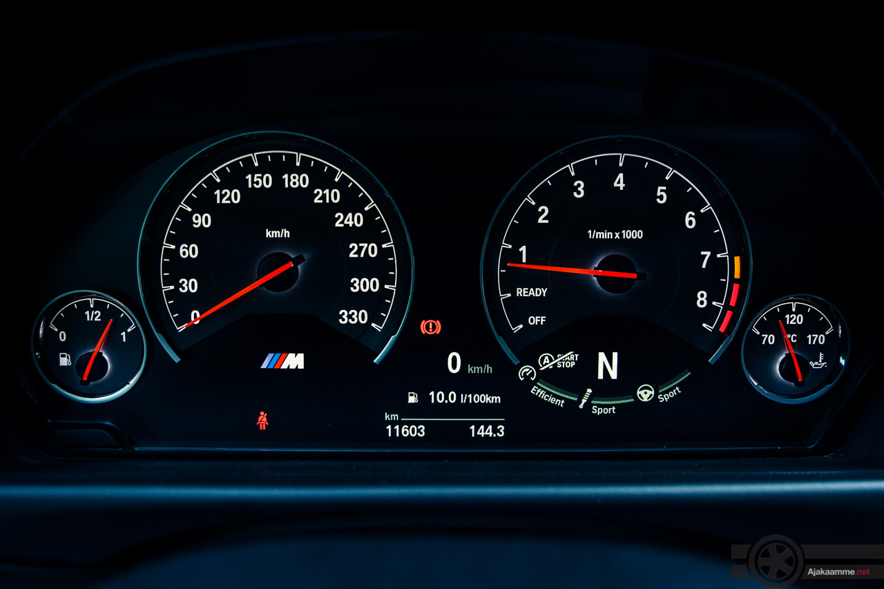 Start -nappulan painallus saa kuusisylinterisen ahdetun rivimoottorin hörähtämään käyntiin. BMW tarjoaa kuljettajalle nykyisistä M-malleista tuttuun tapaan valtavasti mahdollisuuksia säätää autoa vastamaan omaa ajotapaa: ohjaukselle, alustalle, vaihdelaatikolle ja moottorille kaikille kolme asetusta. Kaikkien yhdistelmien läpikäymiseen kuluisi ikuisuus. Onneksi oma maku löytyy varsin nopeasti. Ohjauksen comfort –asetus tuntuu turhan tunnottomalta. Vaikka tiukin asetus tuntuukin hieman raskaalta, on keskimmäinen sport-asetus juuri sopiva. Se onnistuu tuomaan ison tukun tuntumaa muuttumatta turhan raskaaksi tai yhtään tahmeaksi. Kyseessä ei ole paras ajamamme ohjaus, mutta nykymittapuulla ehdottoman hyvä. Vielä kun saman ohjauksen saisi jokaiseen BMW-malliin.