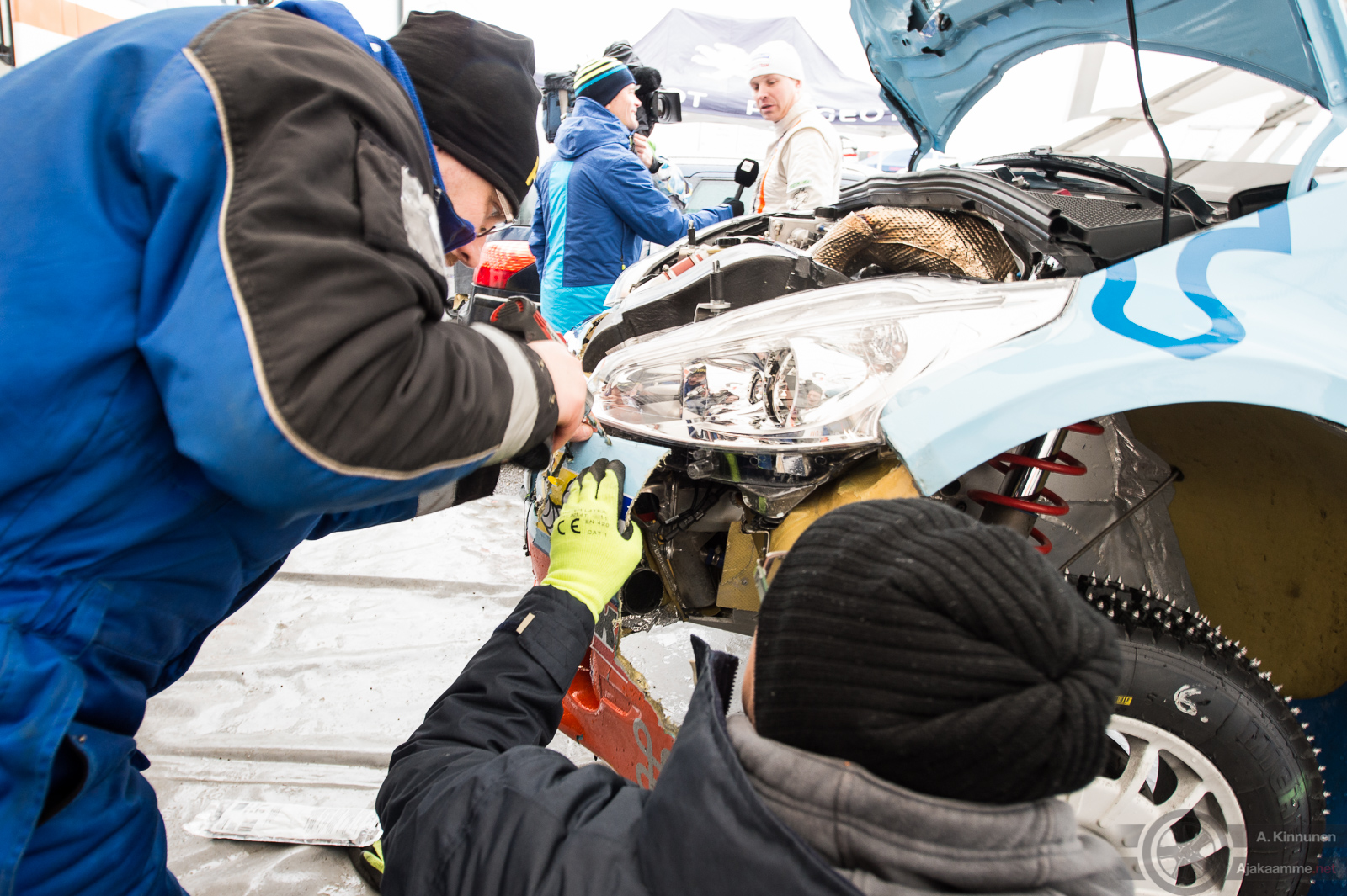 Juha Salon Peugeot 208 T16 R5 Pohjanmaa-rallissa EK5 jälkeisessä huollossa. Huomioi nippusiteillä korjattava etupuskuri. Taustalla Salo antaa haastattelua Ylelle.